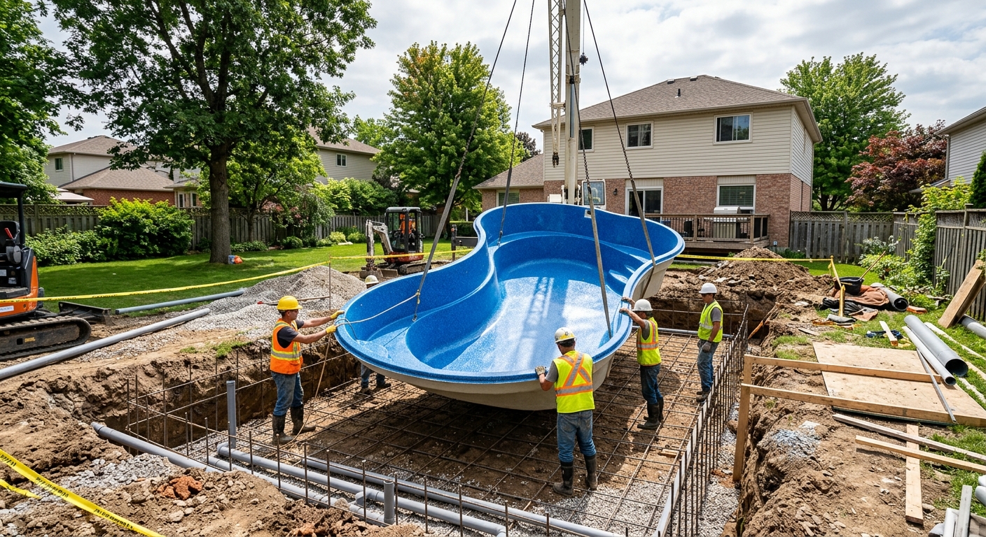 Conception, excavation, installation de la coque (fibre de verre ou beton projete), raccordement de la filtration, mise en eau et finition. Permis inclus.