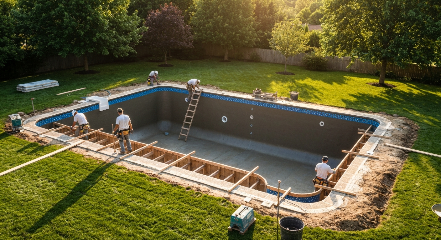 Conception, excavation, installation de la coque (fibre de verre ou beton projete), raccordement de la filtration, mise en eau et finition. Permis inclus.