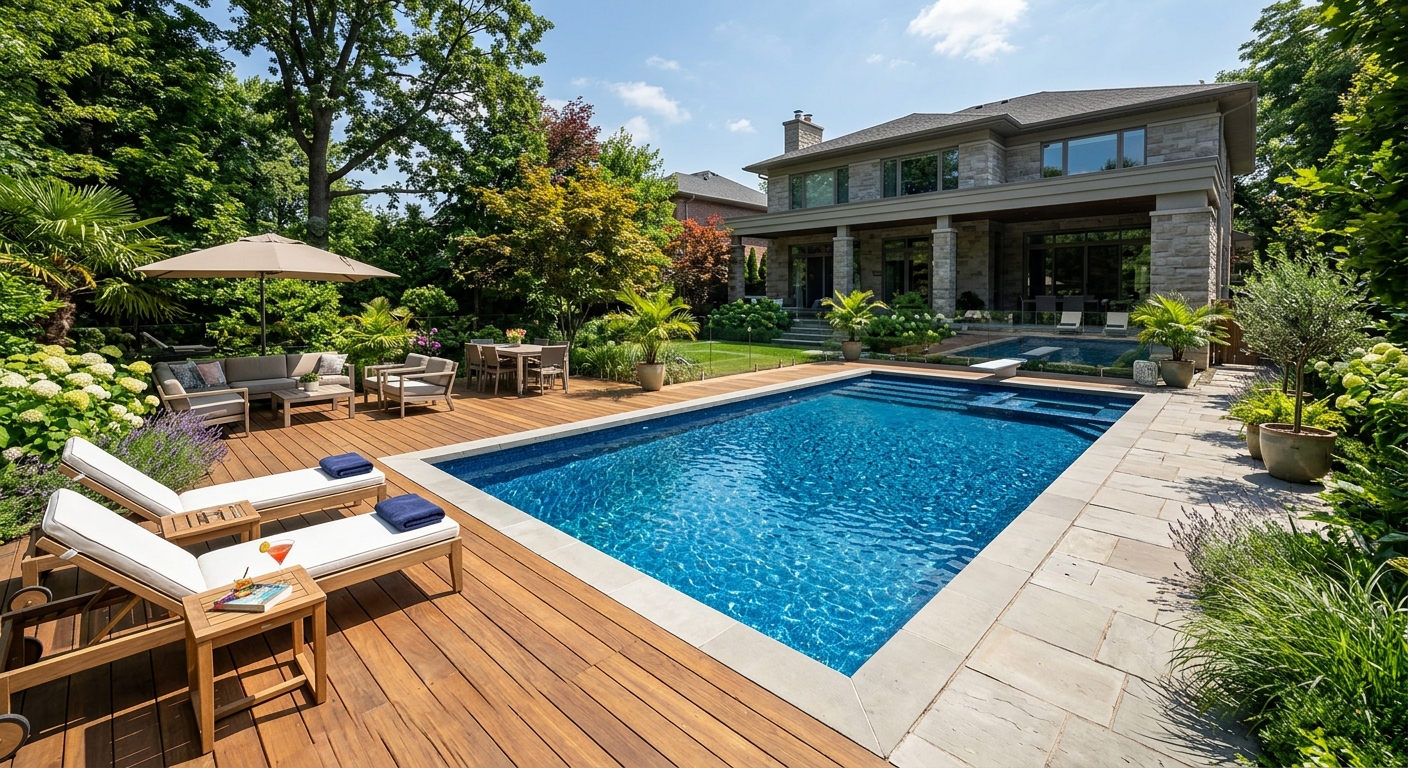 Amenagement de la zone autour de la piscine : patio en beton, pierre naturelle, bois composite ou paver. Cloture de securite obligatoire incluse dans les projets complets.