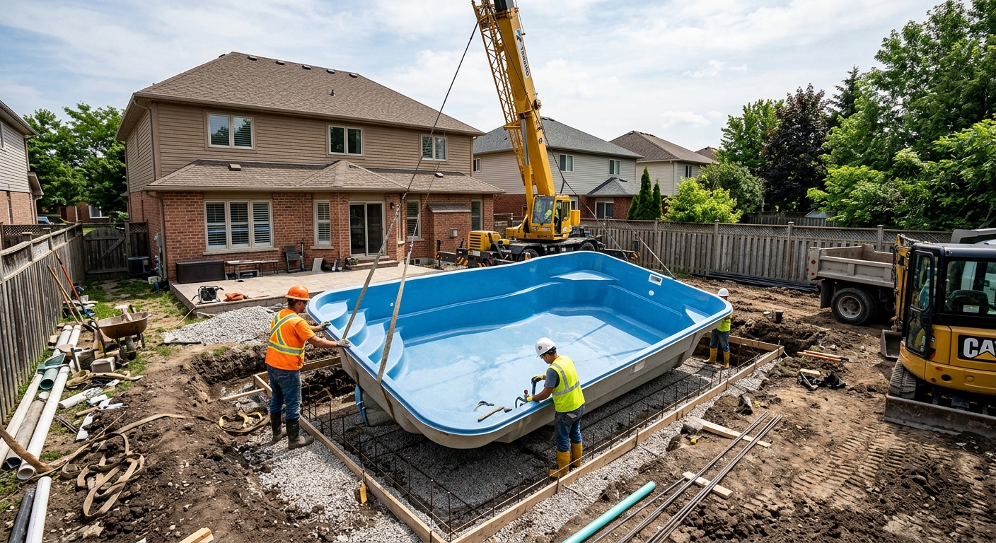 Conception, excavation, installation de la coque (fibre de verre ou beton projete), raccordement de la filtration, mise en eau et finition. Permis inclus.