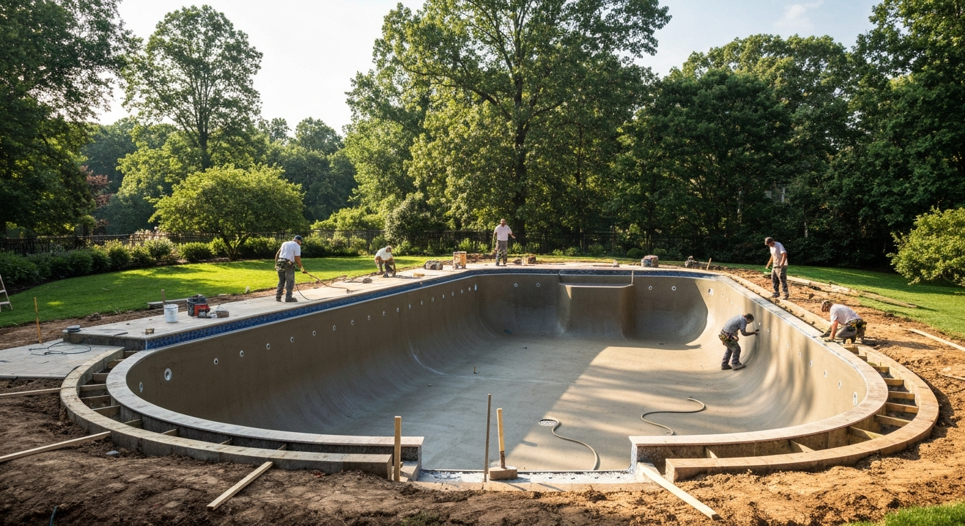 Conception, excavation, installation de la coque (fibre de verre ou beton projete), raccordement de la filtration, mise en eau et finition. Permis inclus.
