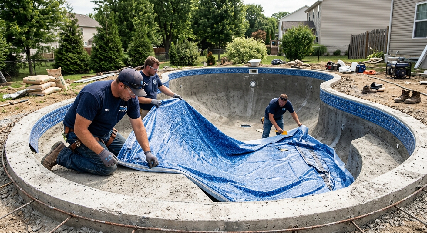 Conception, excavation, installation de la coque (fibre de verre ou beton projete), raccordement de la filtration, mise en eau et finition. Permis inclus.