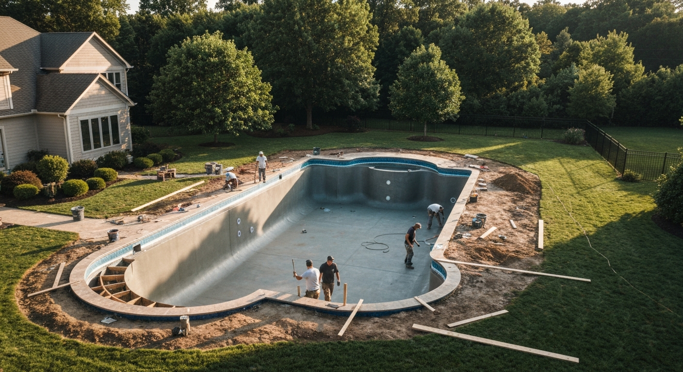 Conception, excavation, installation de la coque (fibre de verre ou beton projete), raccordement de la filtration, mise en eau et finition. Permis inclus.
