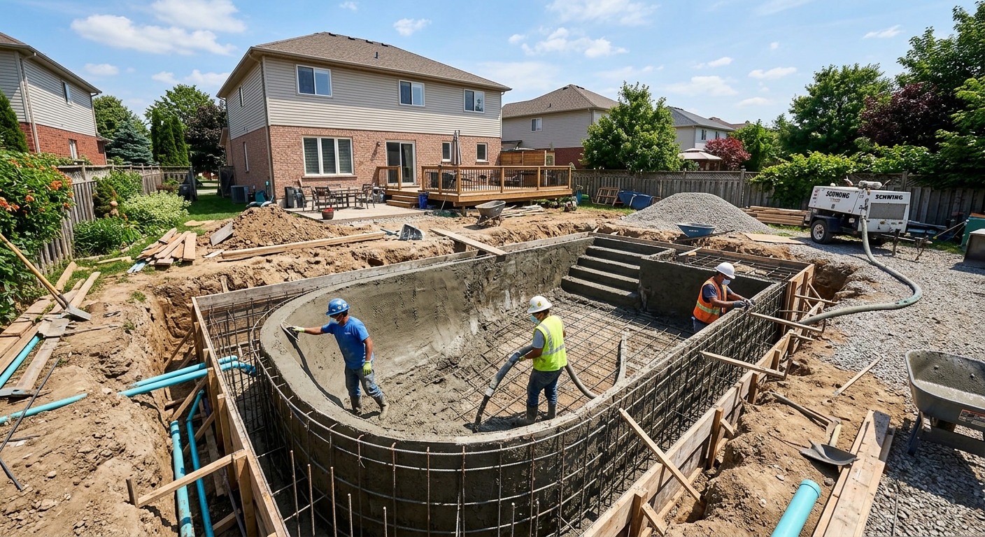 Conception, excavation, installation de la coque (fibre de verre ou beton projete), raccordement de la filtration, mise en eau et finition. Permis inclus.